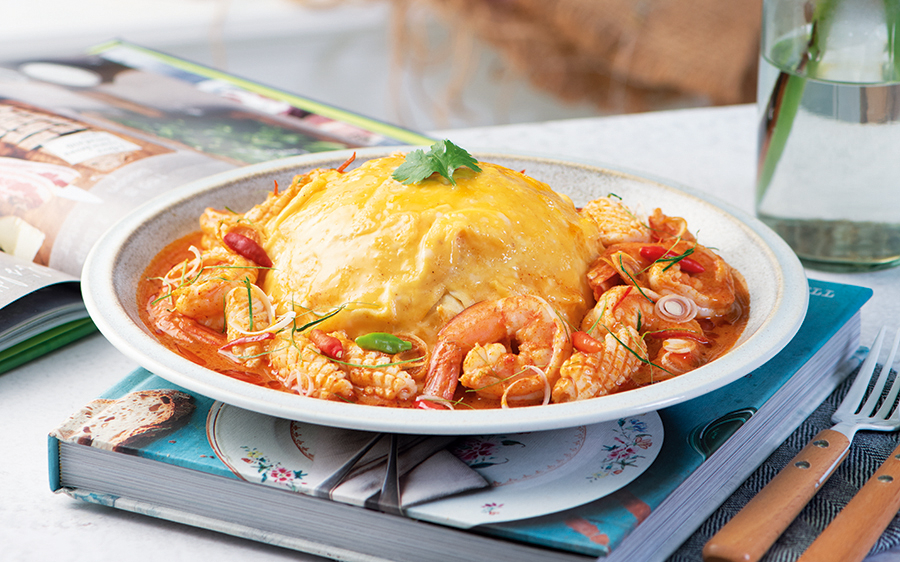 3. เติมน้ำลงในกระทะ ใส่ตะไคร้ ใบมะกรูด ข่า ต้มจนเดือด ใส่กุ้ง ปลาหมึก ผัดจนสุก