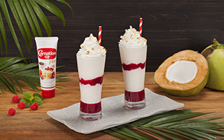 2. จัดเสิร์ฟโดยตักแยมราสเบอร์รีลงในแก้ว ตามด้วยน้ำมะพร้าวปั่นลงไปครึ่งแก้ว ตักแยมราสเบอร์รีใส่อีกชั้น เทน้ำมะพร้าวปั่นที่เหลือ บีบ แมกโนเลีย กูร์เมต์ วิปปิ้งครีม ที่ตีขึ้นฟูแล้วด้านบน โรยมะพร้าวคั่ว พร้อมเสิร์ฟ
