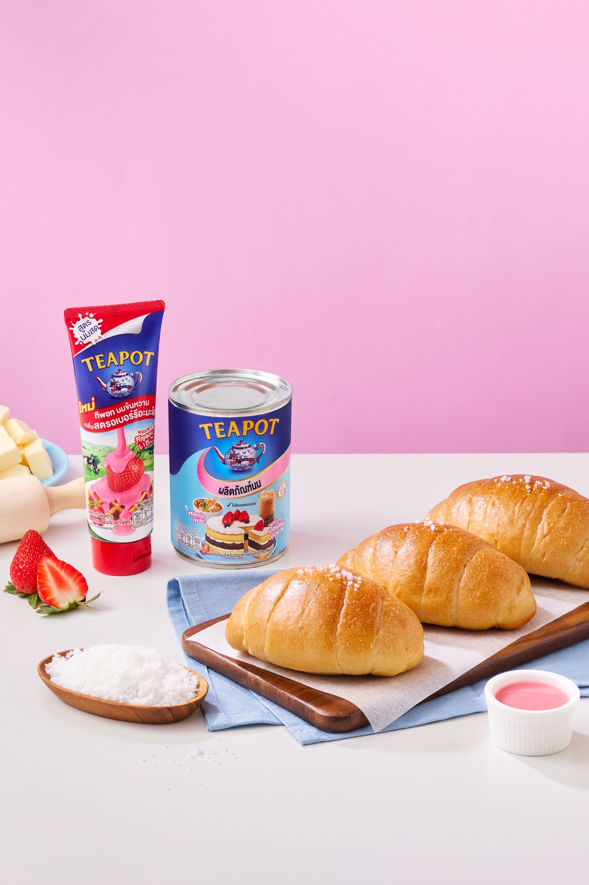 หรือจนขนมปังมีสีเหลืองทอง เสิร์ฟขนมปังเกลือพร้อมกับที่พอท นมข้นหวาน สูตรนมสด รสสตรอเบอร์รีอะมะโอ